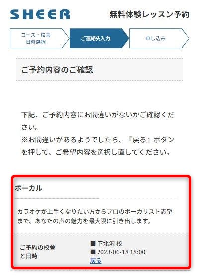 選択したレッスンコースと校舎(下北沢校)、日時の確認画面が表示されます。
