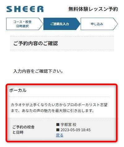 選択したレッスンコースと校舎(宇都宮校)、日時の確認画面が表示されます。